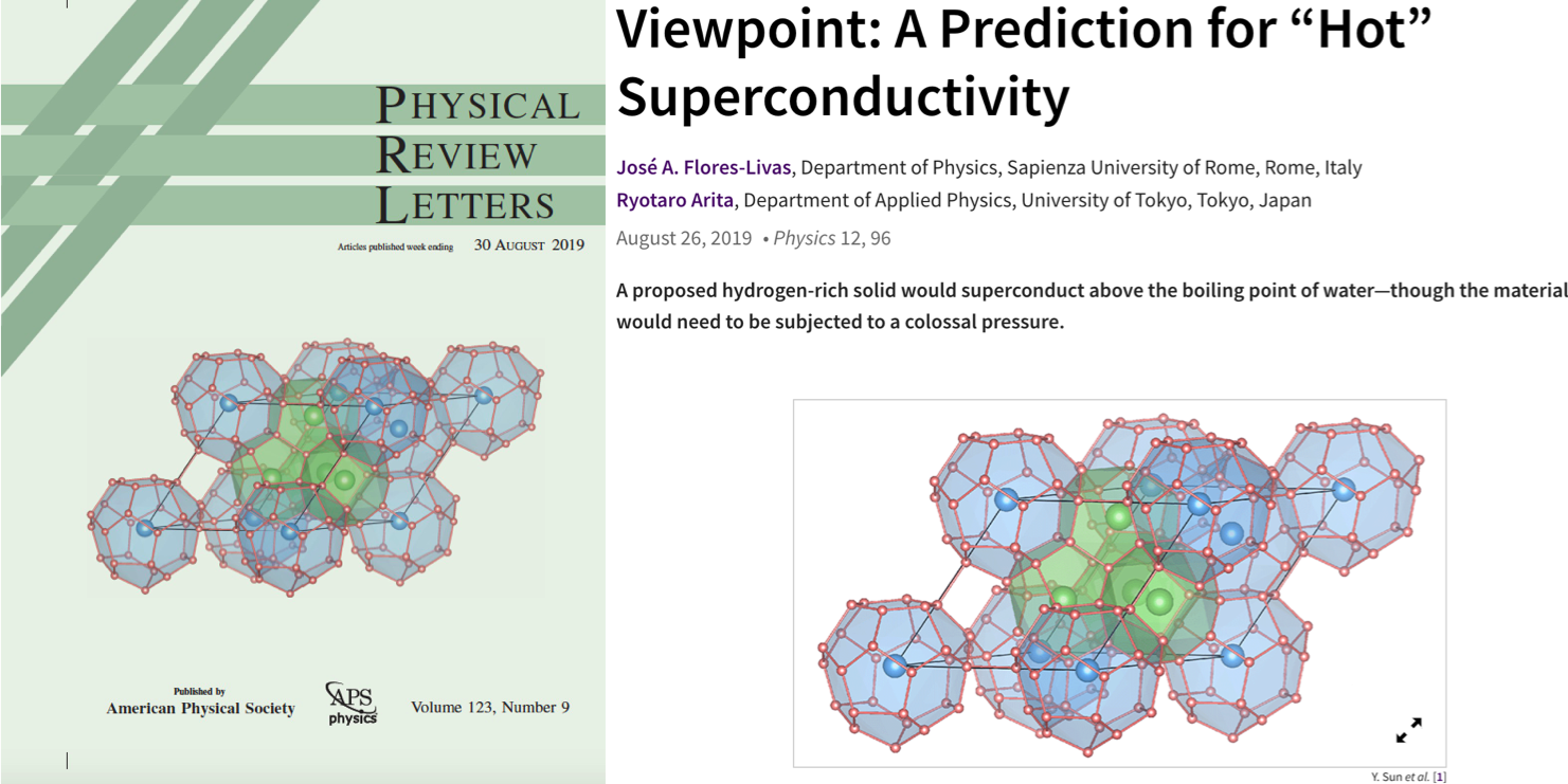 2, Ying Sun#, Jian Lv#, Yu Xie#, Hanyu Liu*, and Yanming Ma*,"Route to a Superconducting Phase above Room Temperature in Electron-Doped Hydride Compounds under High Pressure" Phys. Rev. Lett. 123, 097001 (2019) (Editor suggestion; Physics viewpoint)